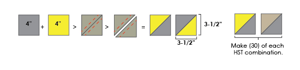 a) Make (6) HST units from your Fabric B & C 4-1/2” squares in the same manner as you made the units in step 1. Their finished dimensions should be 4” square.