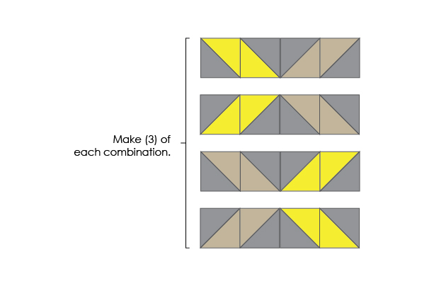 b) Using 4” squares, make (8) Fabric C/D HST units. Sew (4) together in pairs, and sew the remaining (4) to the outer sides of the A/C & B/C pairs you just made.