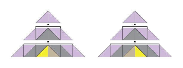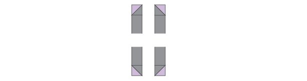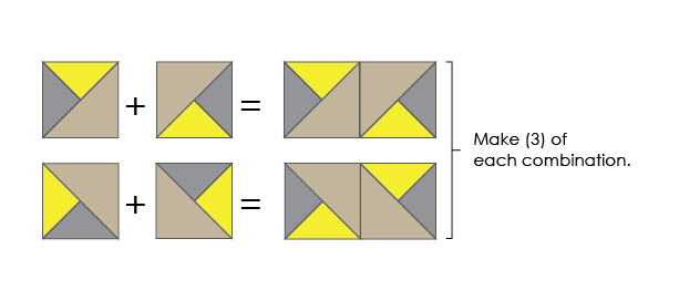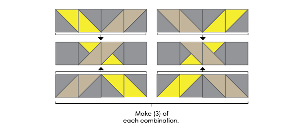 c) Join the HST units in pairs as shown. Take care regarding the “slant” of each pair – once the pair is sewn, you cannot change the direction of the slant by rotating it.