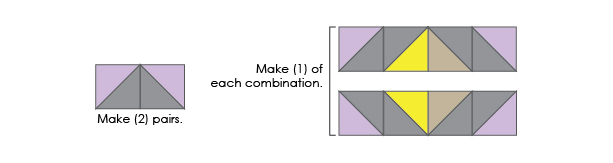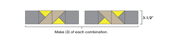 a) Make (2) A/C HST units and (2) B/C HST units out of 4” squares – the units’ final dimensions should be 3-1/2” square. Sew these units together in pairs as shown.