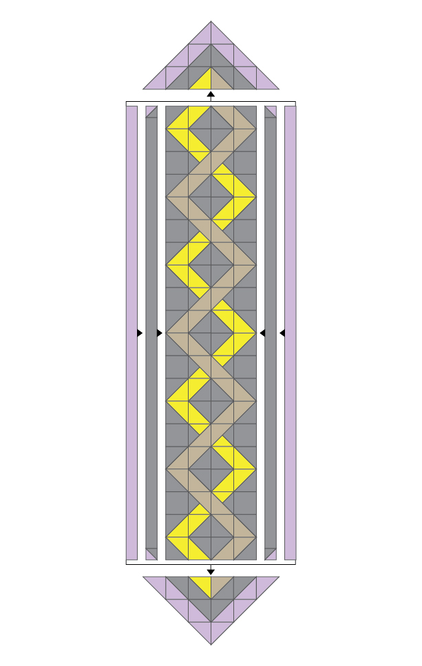 e) Cut (2) strips from Fabric D, 2” wide x the length of the Center. Sew them to the outer edges of the Inner Borders as shown in the Assembly Layout.