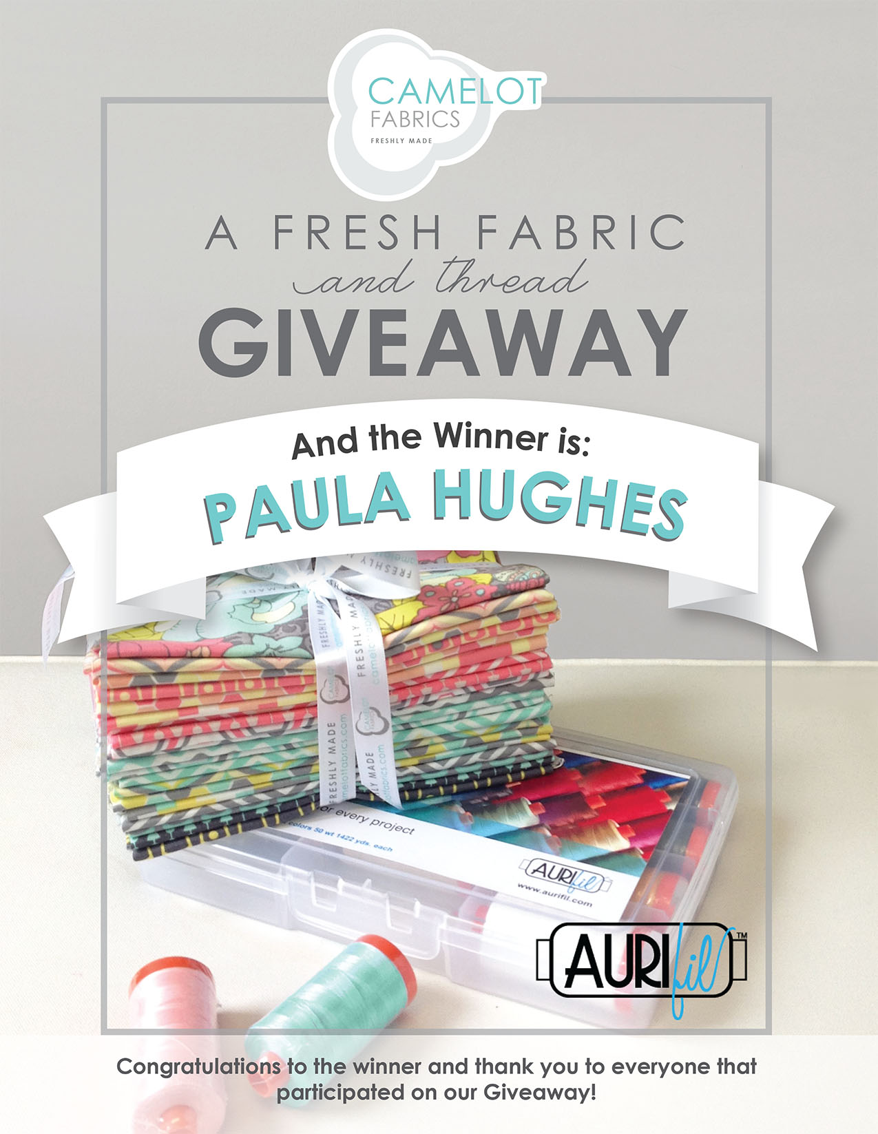 Congratulations, Paula!! We are SOO excited for you!! Please send us your mailing address to info@camelotfabrics.com so that we can send along your prize. If you create something, we would really love to see!! :) Thank you everyone for taking the time to participate in this week’s Winsday – you all are INCREDIBLE!! And, Aurifil, thank you again – we are so appreciative of your partnership. Lots more fun stuff to come at CF, so be sure to stay connected with us. Have a great day!!