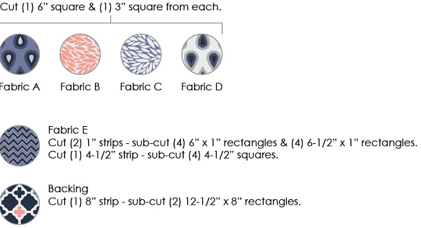 4. Sew a 1” 6-1/2” Fabric E rectangle to the bottom edges of your Fabric A & Fabric B units.