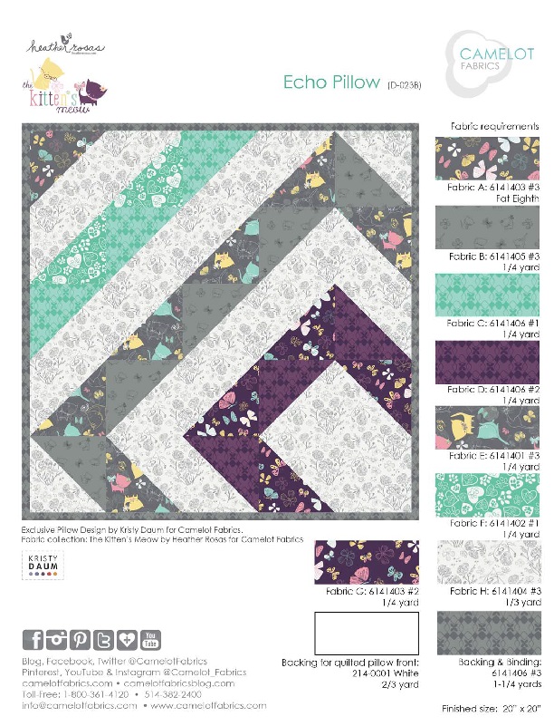 Time for our How To’s Day! Today we are featuring our Echo Pillow Tutorial by Kristy Daum, from our Free Projects Program. Our Echo Pillow has an architectural feel to it, with the fabrics creating angular lines throughout. We love how the linear designs stand out against a more neutral background, to really give that pop of color to any space. We chose to feature Echo with our The Kitten’s Meow Collection, to showcase how versatile this pillow is. How adorable would this pillow look in a little girl’s room? Another fabulous design by one of our faves, Kristy!!