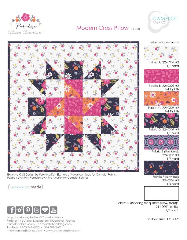 Time for our How To’s Day! Today we are featuring a beautiful pillow pattern for our Free Projects Program, made by the lovely Veronica Koh Eischeid of VeronicaMade. Modern Cross is a fun take on a flower/star cross design, which is the focal point of the pillow. Mixing and matching different patterns is what makes this pillow awesome; we love keeping the background neutral so that the middle pops! We chose to feature our Paradise by Alisse Courter Collection with Modern Cross, choosing our bright orange, fuchsia, and purple prints for the middle, and a pretty floral, neutral background. We love how it turned out, and think it would be beautiful in any feminine space.
