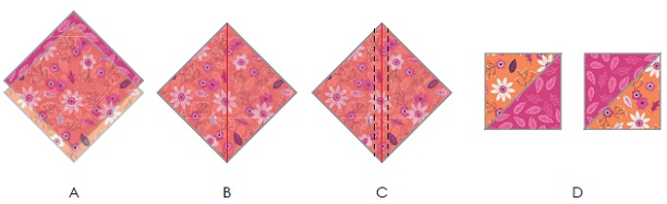 2. Repeat Step 1 with your (4) 3” Fabric A squares & (4) 3” Fabric D squares, to make (8) HST
