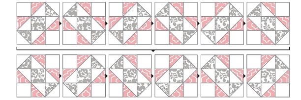 1. Referring to the Assembly Layout, sew the blocks together in (2) rows of (6). Note the orientation of the blocks – they should alternate direction.