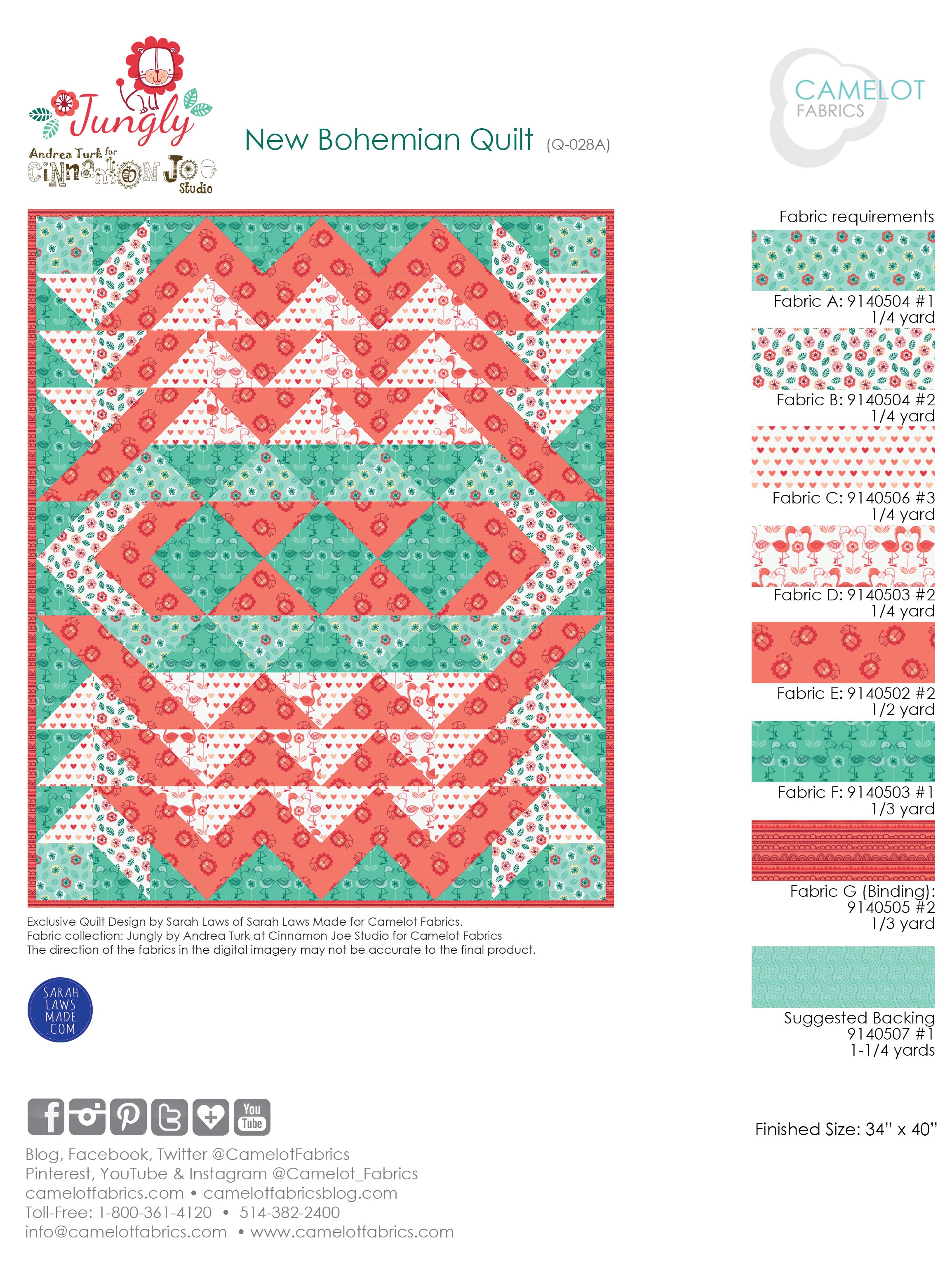 It’s How To’s Day time! Today we are featuring our New Bohemian Quilt by Sarah Laws Made. New Bohemian is a modern, geometric design of chevrons and triangles all working together to create a stunning quilt. It is also lap-sized, so it is perfect for cozy-ing up with for a night in with hot cocoa – stylish and comfy! Nothing is better than that ;) We chose to showcase our New Bohemian quilt in one of our latest collections, Jungly by Andrea Turk for Cinnamon Joe Studios. We love how fresh and vibrant the red-orange and spearmint colors look, with the adorable jungle animal prints.