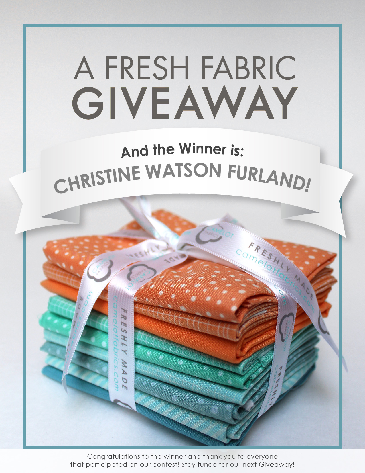 Christine Watson Furland: I hope you will enjoy your Fat Quarter Bundle. If you can please email us your mailing address, with phone number, to marketing@camelotfabrics.com by June 29th, 2016. We cannot wait to see what you create with these fat quarters. Please send us a picture for our Fan Friday blog!