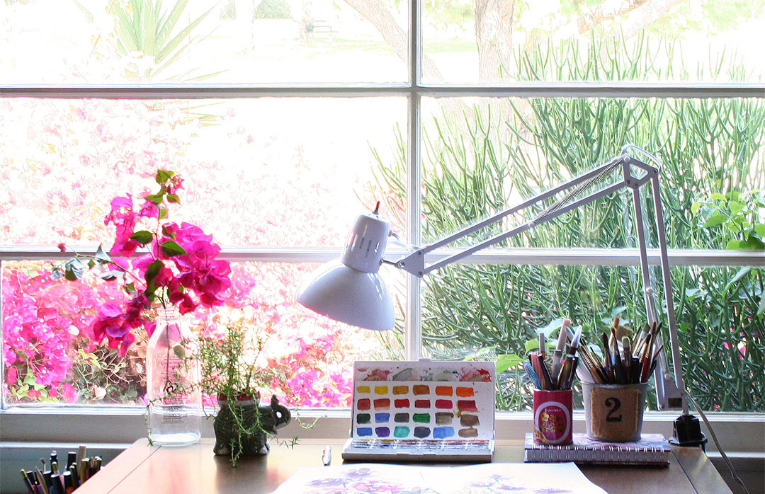 SB: My studio is a bright and airy space with a lot of windows, which I love! Since I work out of my one bedroom house, I use half of the living room as a studio and the other half as a regular living room. My drawing table is where the project begins, where I start with sketching ideas and painting. From there, I scan the paintings into the computer and turn them into repeat patterns that can be used on fabric and other surfaces.