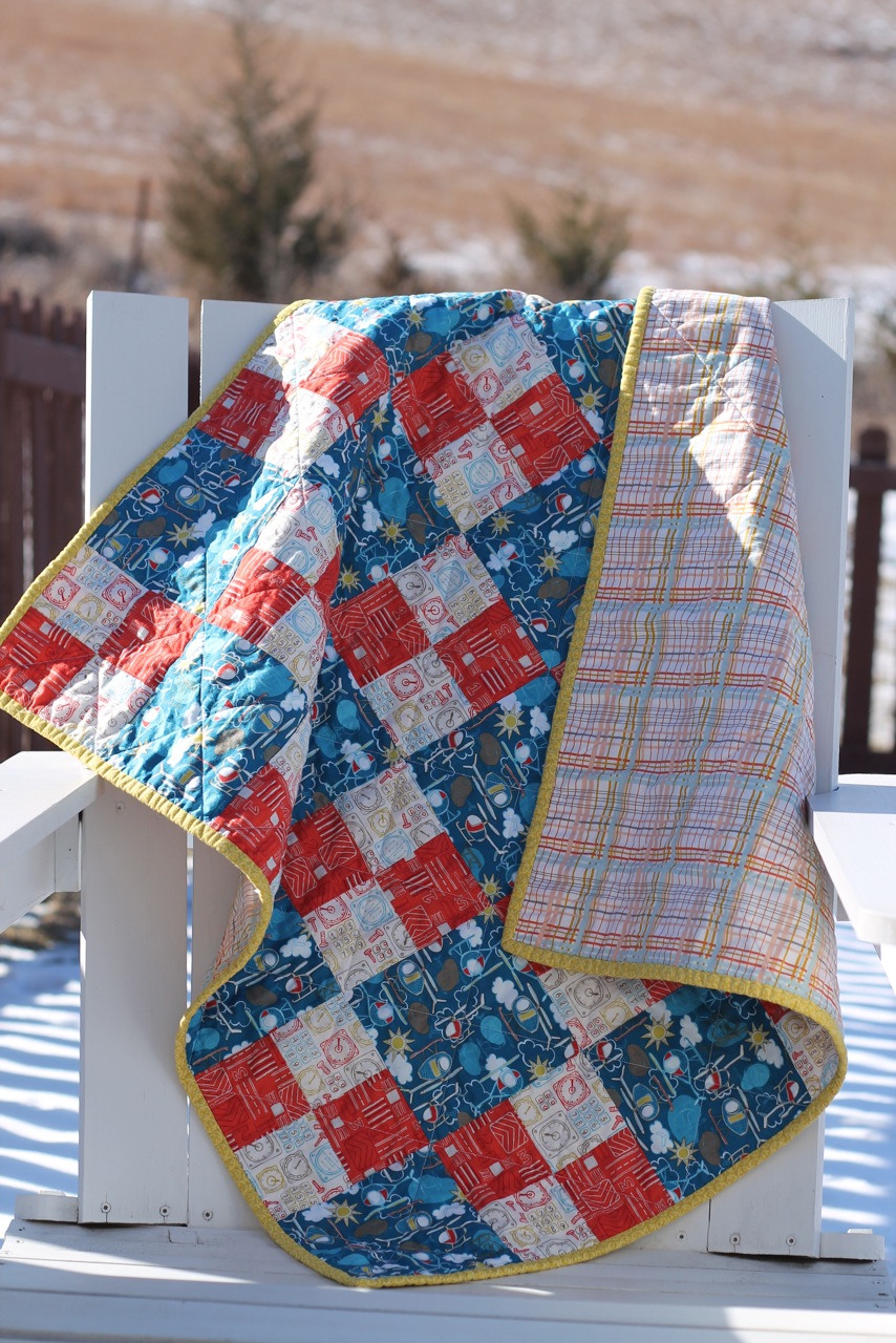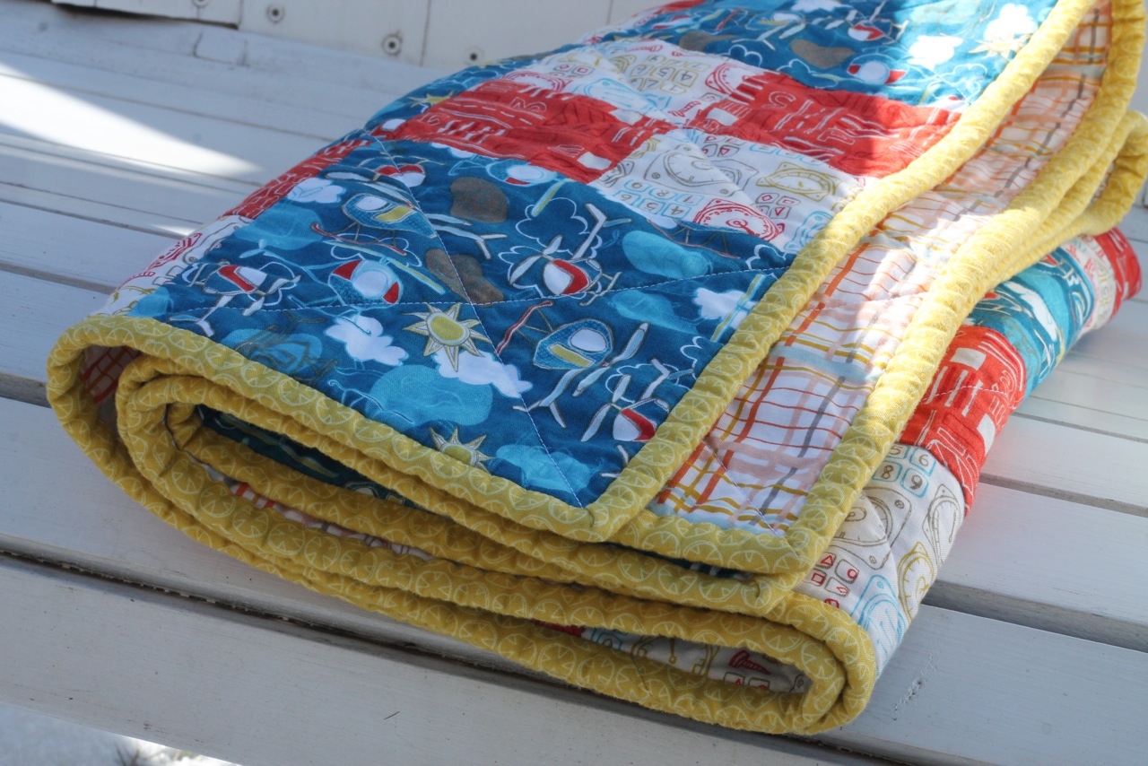 It is an absolutely stunning quilt – the reds, blues, and yellows vibrant and cheery, and would make any future pilot-in-training very happy!! You did such a wonderful job, Katy! :)