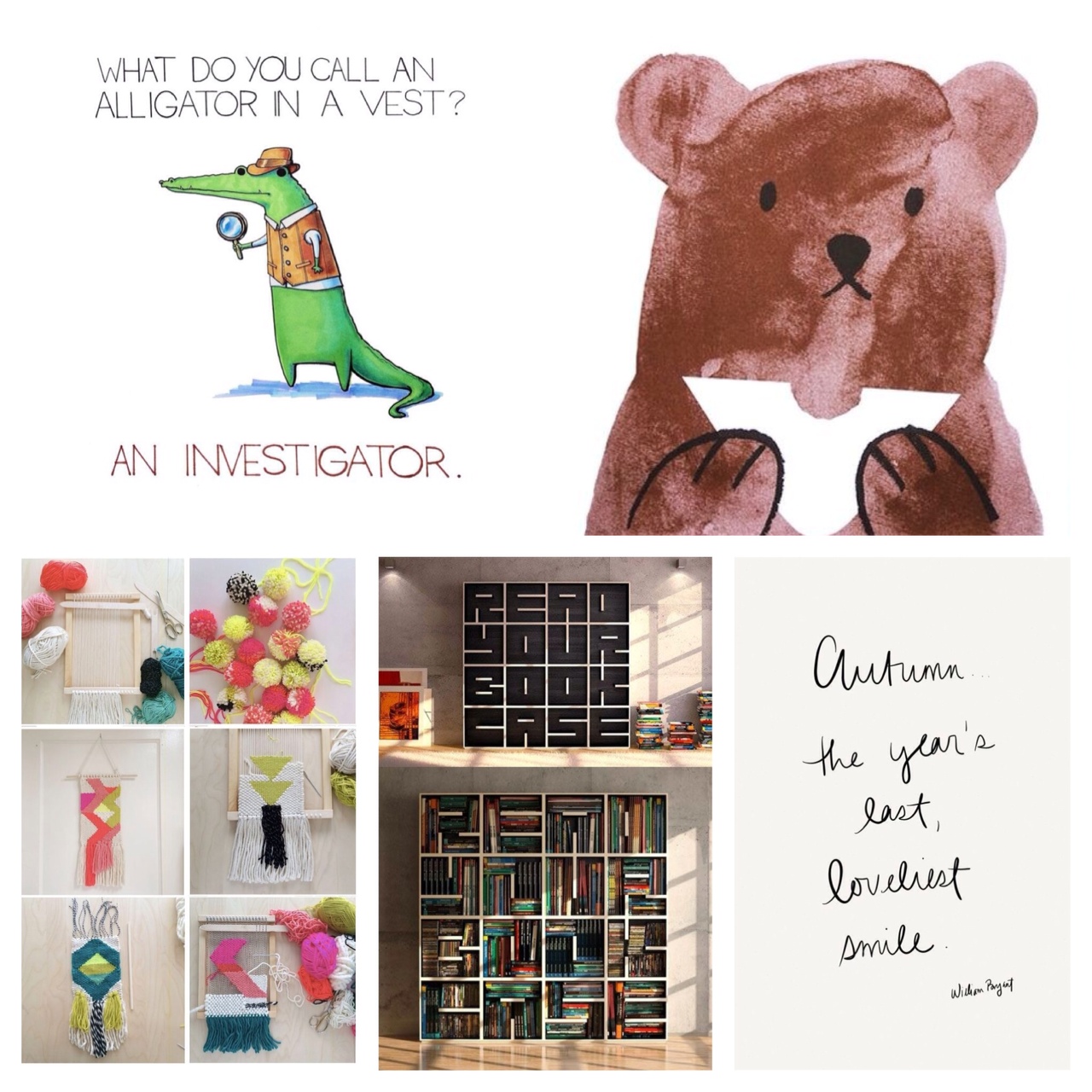 Time for our What We Love #17 ♥ Today we bring to a collection of cute and beautiful things that have been inspiring the Camelot Design Studio as of late. It’s officially the first week of Autumn, so of course we have been transitioning our clothing, shoes, and drinks (PSLs!) to fit the season. We are so excited for apple and pumpkin picking, hay rides, Halloween, plaid everything, and sweater weather! We’re sharing some light-hearted goodies with you all, that is sure to put everyone is a great mood, such as this adorable grill cheese eating bear and this alligator joke. On to the rest of what we love… ♥